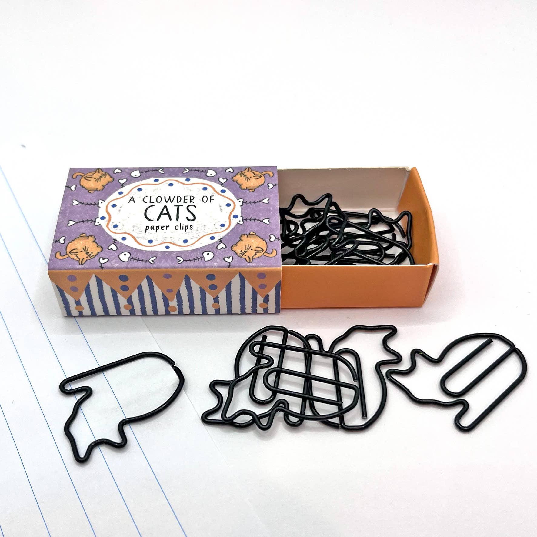 A fun set of twelve black cat paper clips in a beautifully illustrated box. These cute paper clips are great from school work or bullet journaling. The box has been designed by Megan in Edinburgh. Size: 5.5 x 3cm Amount: 12 Paper Clips Made In China Warning not suitable for children under three.