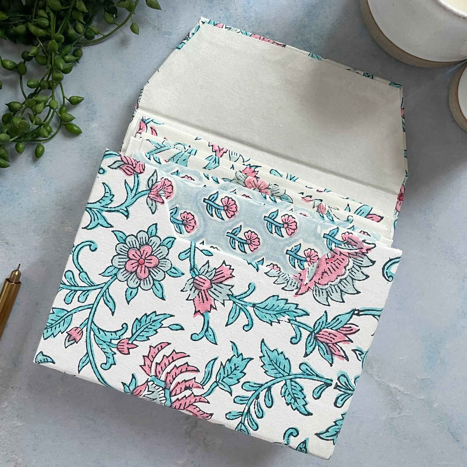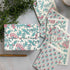 Harriet Block Printed Note Card and Envelope Set in Gift Box Handmade by artisans, these exquisite note card sets are block printed by hand using traditional techniques. Each set is made from FSC certified Cotton Rag Paper and uses natural dyes to produce a truly special correspondence set. The handmade box features a magnetic closure and is sturdy enough to be repurposed as storage. The Each set includes: A Presentation box 6 block printed A6 cards (3 of each pattern) 6 self seal envelopes with block printed lining (3 of each pattern)