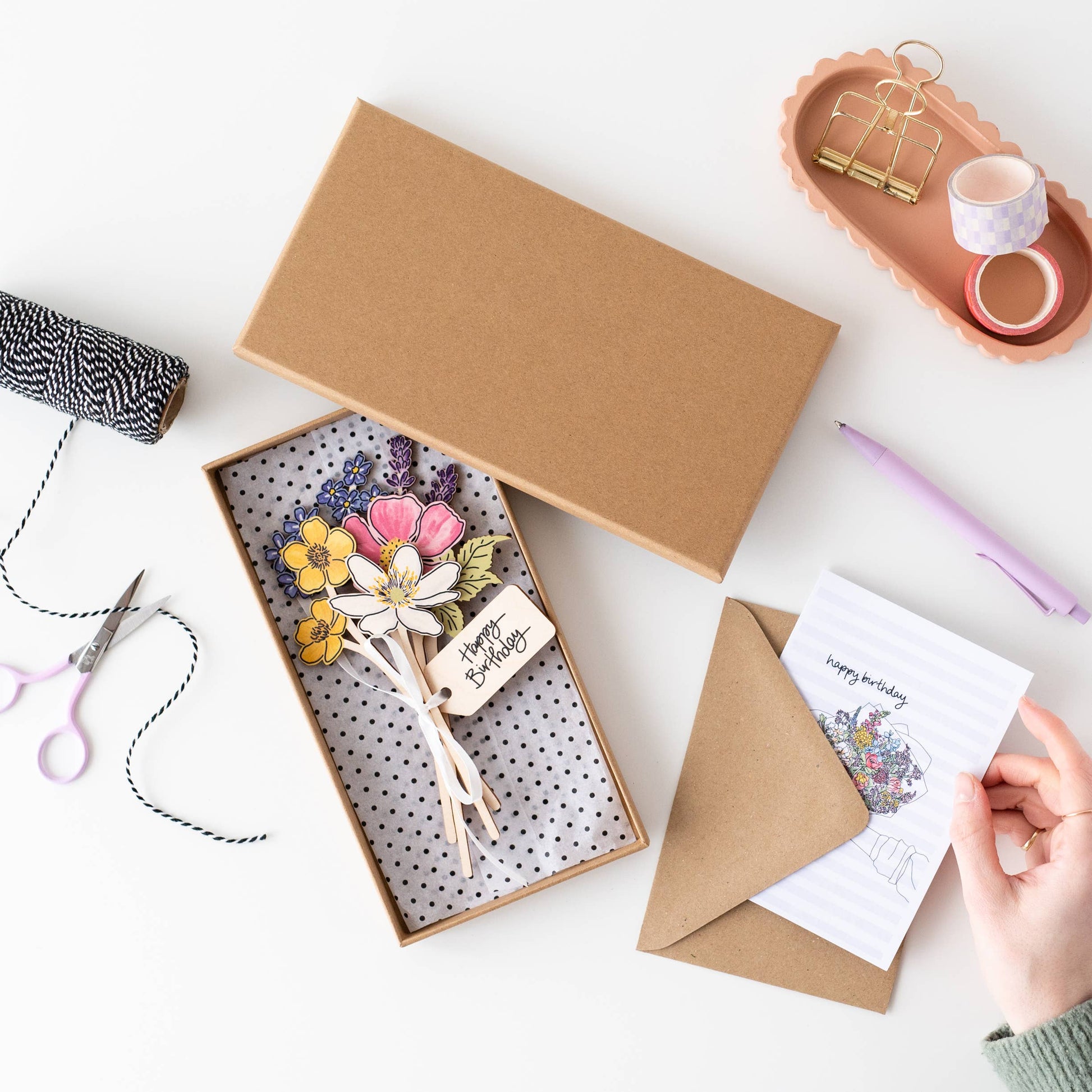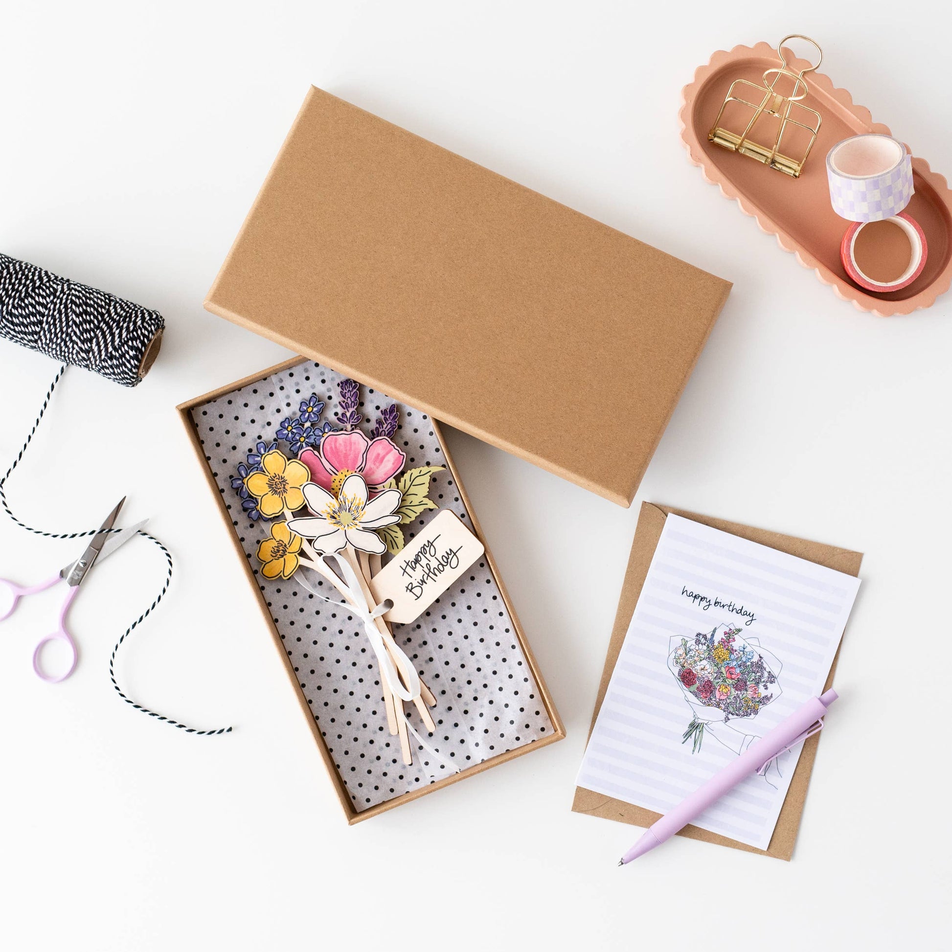 This birthday bouquet of wooden wildflowers incudes lavender, forget me nots, buttercups, wood anemone and the dog rose. - made from FSC certified, birch plywood - 3mm thick - range from 13 - 19cm high - hand drawn, digitally printed and laser cut by another UK based small business.   Tied with ribbon and a 'Happy Birthday' wooden tag this birthday bouquet of forever flowers come wrapped up in beautiful polka dot tissue paper, inside a luxury kraft brown gift box, ready for display and gifting. Ribbon is also included to tie around the box.