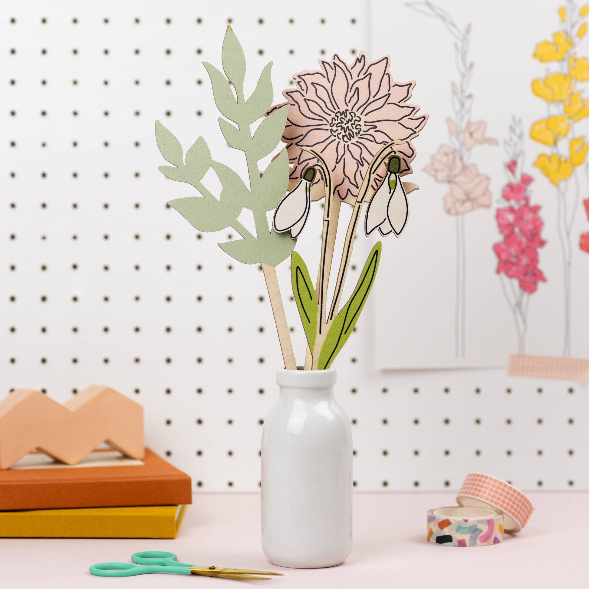 This wooden flower is made from high quality, FSC approved 4mm birch plywood, sourced in the UK. The design has been hand drawn and then UV printed onto the wood and laser cut. Most often purchased as multiples and mini ceramic bottle for immediate display, also available. Customers also often buy with other wooden flowers or foliage to create a fuller display of their favourite blooms. Also available as a greeting card and print in various sizes.
